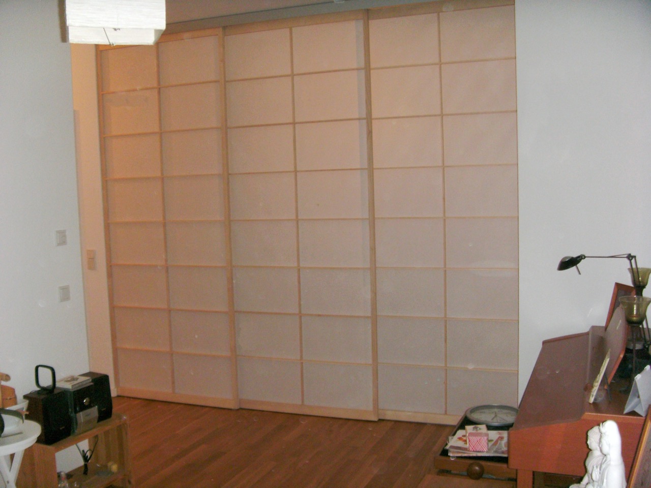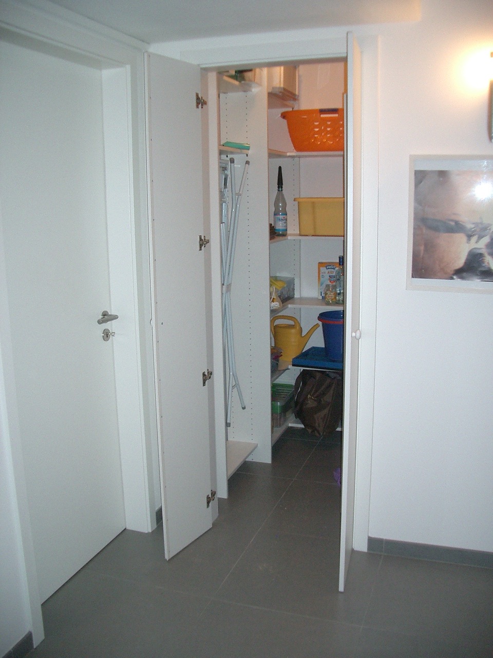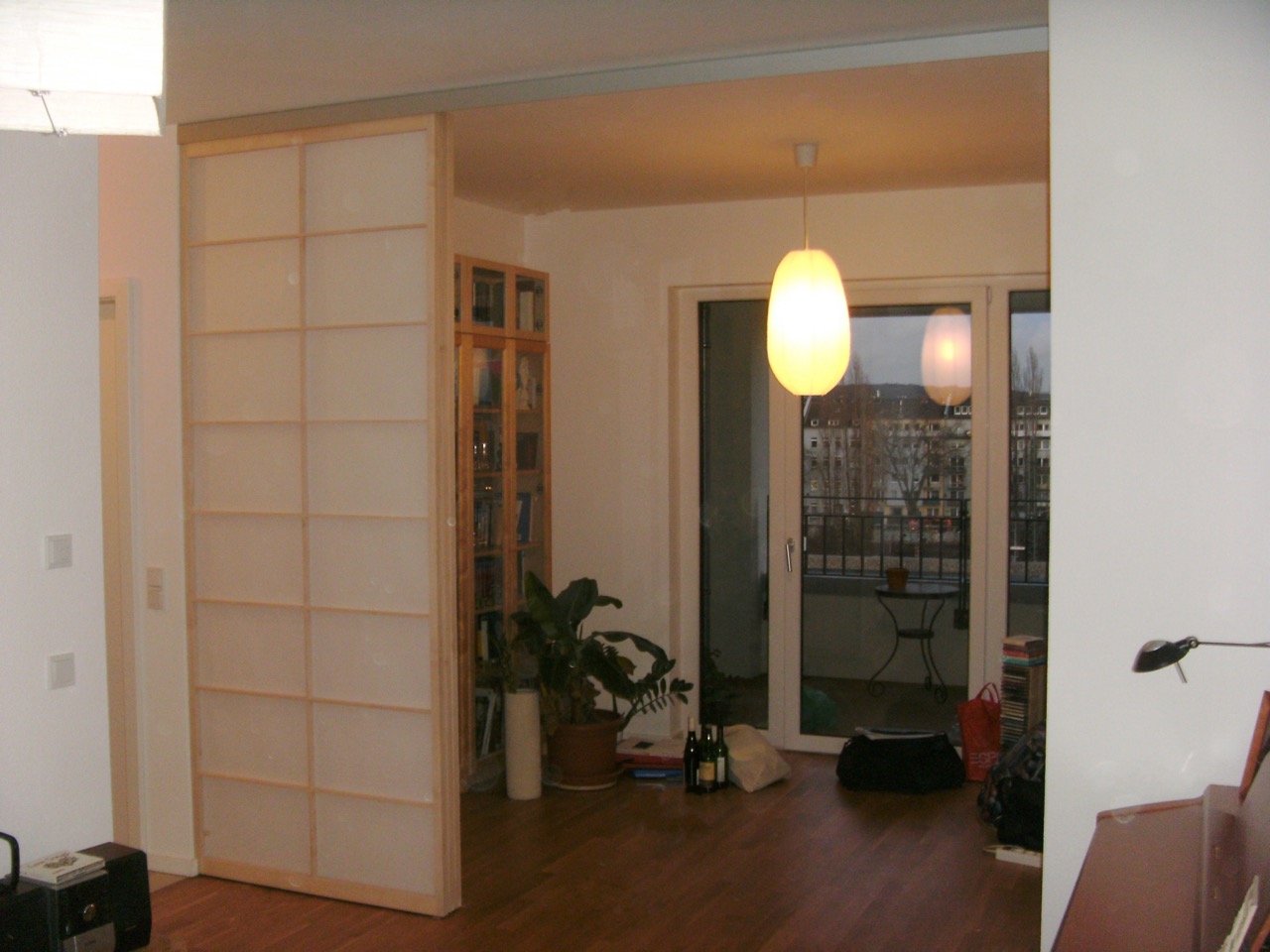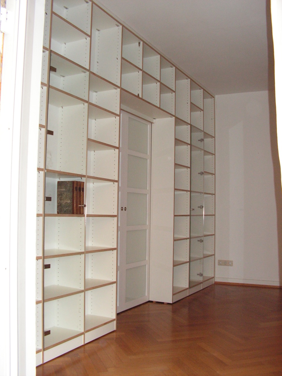 • Beidseitige Regaltrennwand mit integrierten Schiebetüren